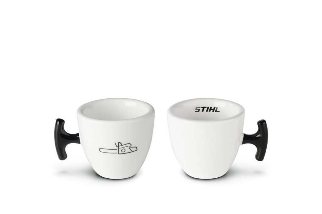 Šálky na espresso STIHL vyrobeny z kvalitního porcelánu, vynikají jednoduchým černobílým designem, který je zdobený motivem motorové pily na přední straně a logem STIHL uvnitř.