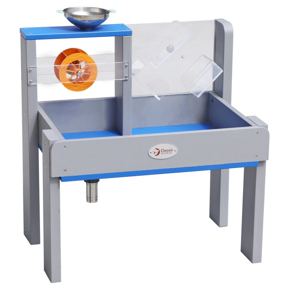 Předškoláci si zamilují experimentování a objevování toho, jak se voda a písek chovají v různých podmínkách. Díky mlýnskému kolu a průhledným skluzavkám se učí o směrech proudění kapaliny a vlivu gravitace. Hraní u tohoto stolu je nejen zábavné, prohlubuje touhu po poznání, ale také děti povzbuzuje k získávání nových znalostí a zvyšuje jejich sebevědomí.