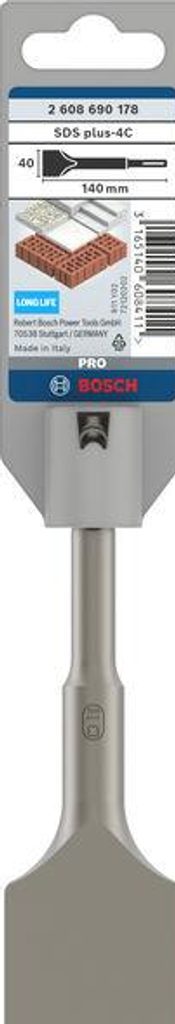 Lopatkový sekáč Bosch PRO SDS plus-4C o rozměrech 40 x 140 mm je navržený pro standardní sekání, díky čemuž je ideálním nástrojem pro různé renovační a sanační práce. Šířka břitu 40 mm zajišťuje efektivní a přesné opracování materiálu, což umožňuje snadné odstraňování starých vrstev, úpravu povrchů nebo jiné stavební úkony.