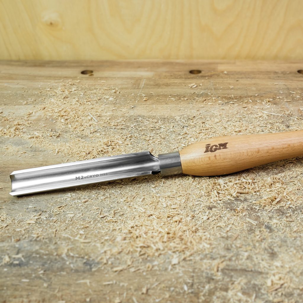 Kryogenně zušlechtěná ocel s tvrdostí 63–65 HRC odolává vysokým teplotám a nespálí se ani při soustružení velmi tvrdých, vysušených dřevin. Masivní ergonomická rukojeť z bukového dřeva výborně sedí v ruce, poskytuje jistý úchop a komfort při delší práci na soustruhu. Pro bezpečné skladování a ochranu čepele je hrubovací soustružnické dláto IGM Cryo dodáváno v praktickém plastovém tubusu.