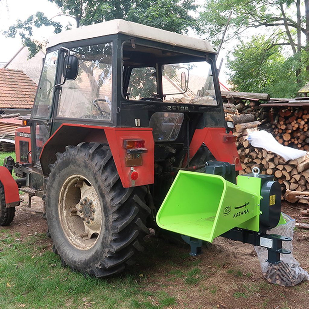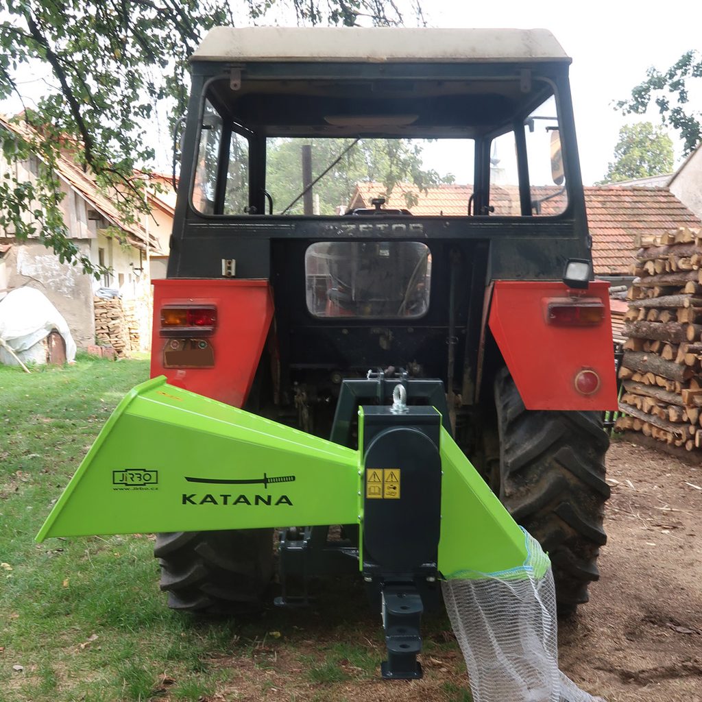 Špalíkovač za traktor JIRBO KATANA - KT1P je ideální pro snadný a efektivní úklid větví po těžbě dřeva nebo zpracování zbytkového dřevního materiálu do průměru až 8,5 cm. Tento stroj vytváří hrubou štěpku o velikosti 8 až 15 cm, v závislosti na průměru větve.
