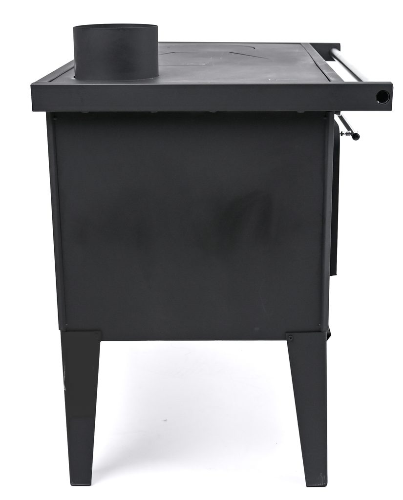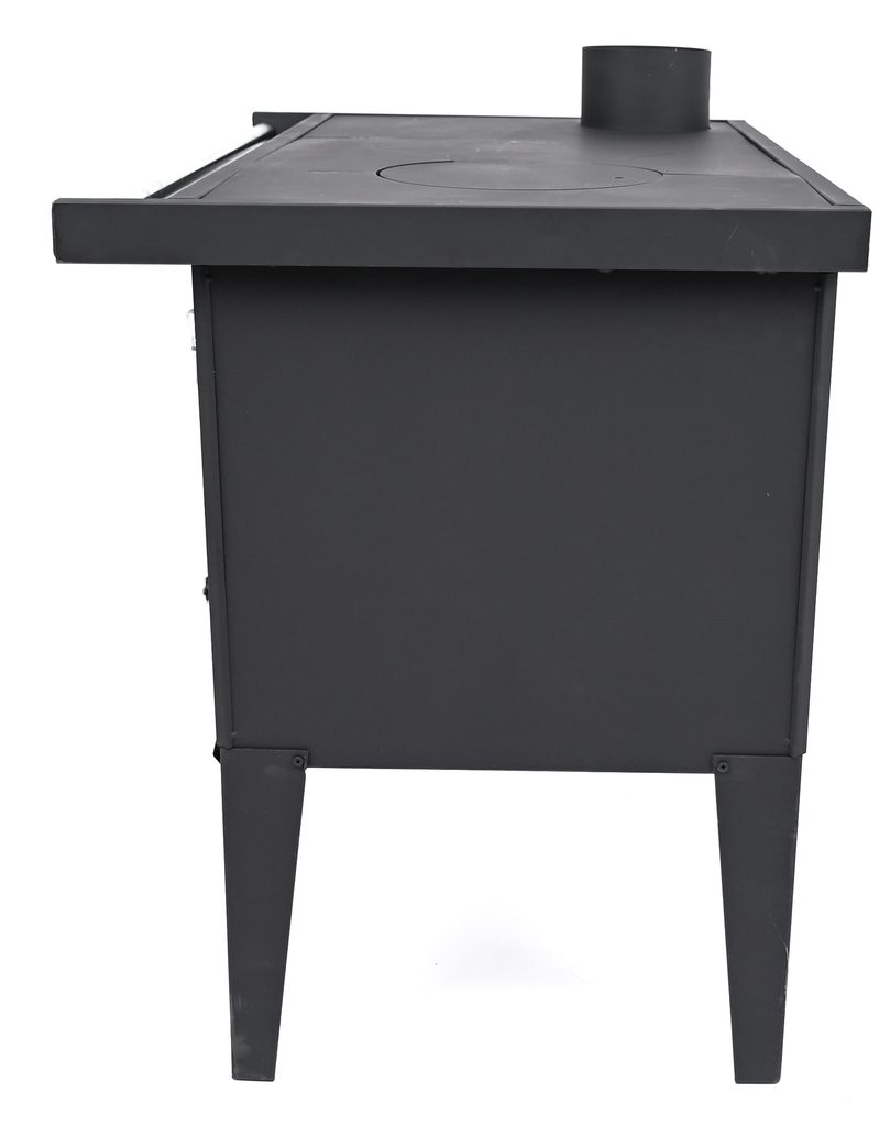 Sporák na tuhá paliva s troubou umístěnou na levé straně pro pohodlné vaření. Sporák je vybaven komínovým vývodem umístěným nahoře na levé straně, což zajišťuje efektivní odvod spalin.