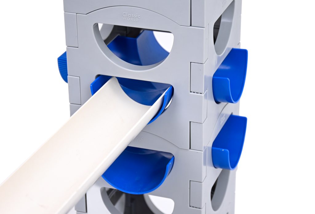Díky použití s vodou, pískem, míčky a auty si děti užijí všestrannou zábavu. Pomozte dětem rozvíjet jemnou motoriku, schopnost kreativity a představivosti. Kostka a trubky lze snadno také demontovat a snadno uložit. Tato sada je také vhodná ke kovové hrací stěně Classic World, na kterou lze stavbu napojit.