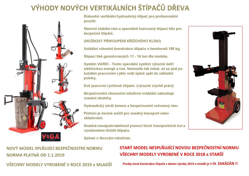 Štípačka VeGA LV1110PRO VARIO splňuje novou normu EU pro bezpečnost práce. Ke standardnímu obouručnímu ovládání tak přibylo nové, větší ochranné rameno a transportní kolo u vodicích rukojetí pro snadný převoz štípačky. Levá ovládací páka je vybavená zařízením pro zajištění stability polena.