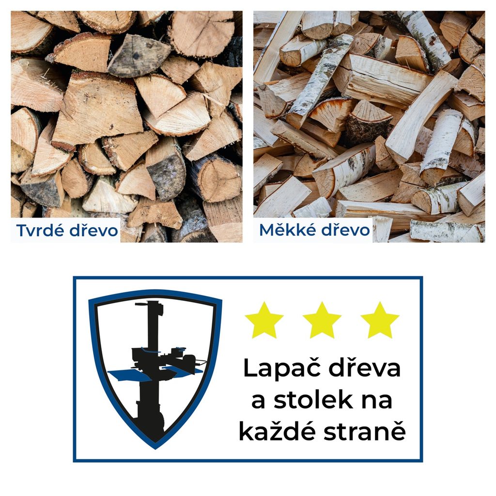 Dále oceníte moderní indukční motor, snadnou manipulovatelnost stroje díky transportnímu madlu, kolům a přijatelné hmotnosti stroje, dále velmi rychlý pohyb pístu, který významně krátí čas potřebný pro práci, promyšlené bezpečnostní prvky (rozšíření stolu, držák polena), dokonale chránící obsluhu stroje a robustní konstrukci zaručující dlouhou životnost stroje.