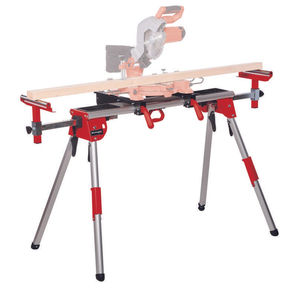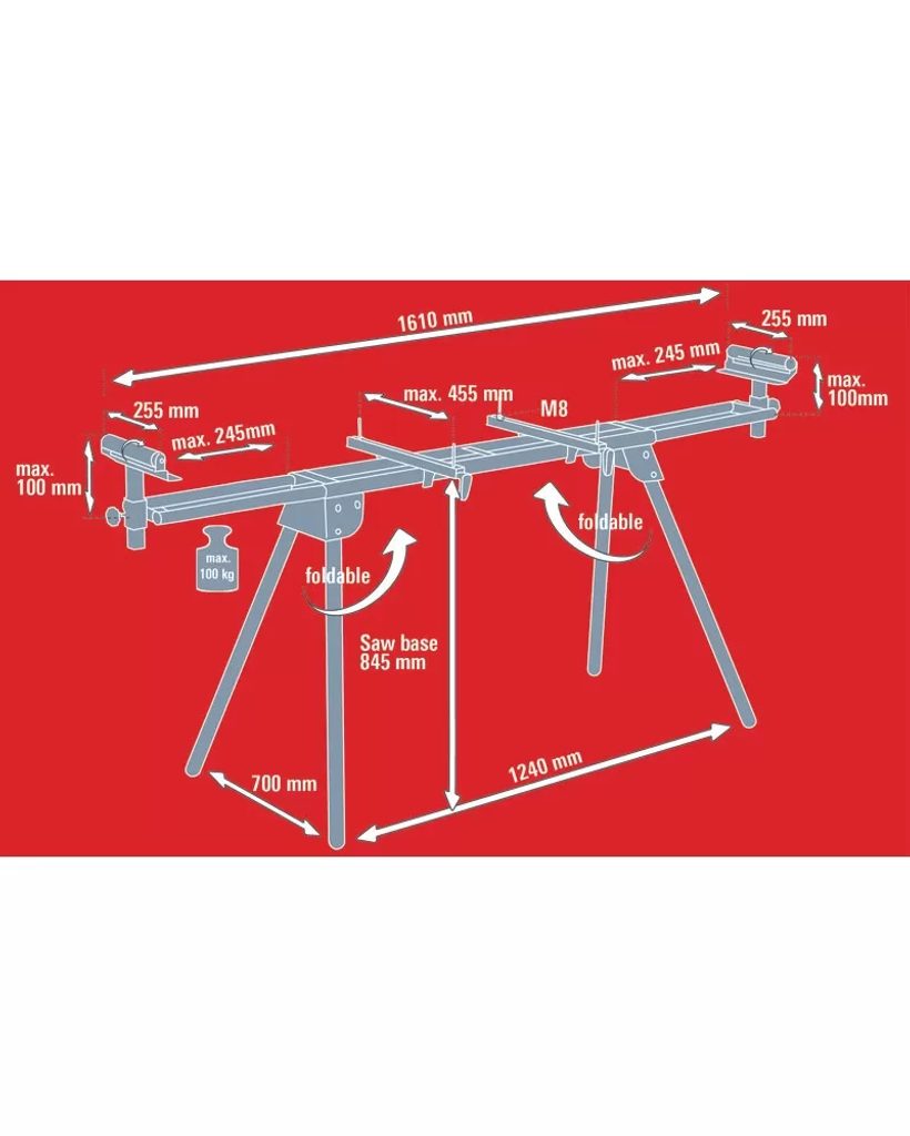 Díky nastavitelným montážním lištám až do délky 455 mm je možné na něj umístit i větší pily. Stabilitu i na nerovném povrchu zajišťuje výškově nastavitelná noha.
