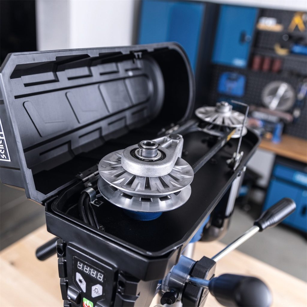 O přesné vedení vrtáku se stará křížový laser, digitální displej a integrované LED osvětlení, které zaručí dokonalý přehled nad pracovním místem. Silný 750W indukční motor zajišťuje tichý a plynulý chod bez vibrací, zatímco litinová konstrukce a robustní sloup (Ø 65 mm) garantují maximální stabilitu.