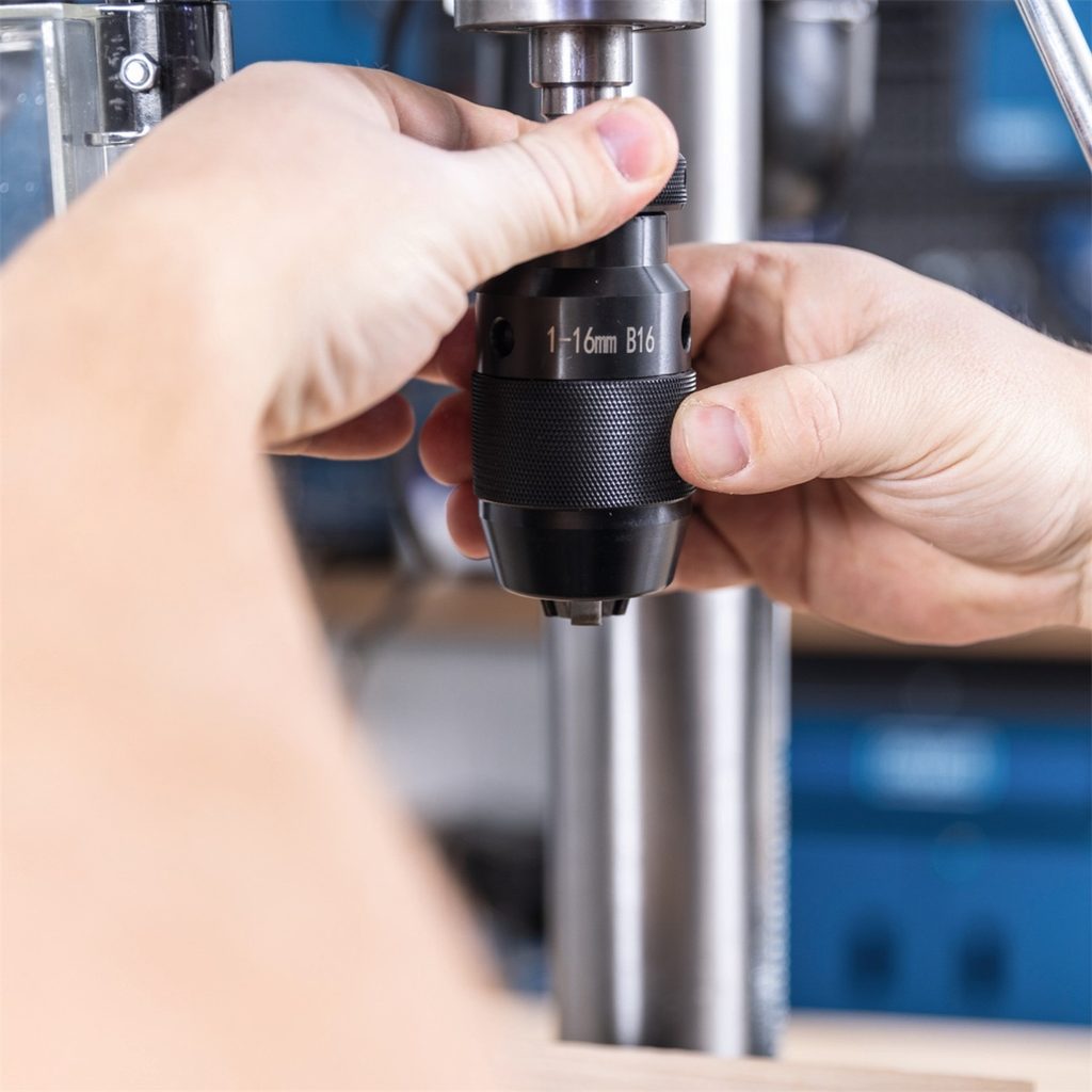 Prostorný pracovní stůl 240 × 240 mm lze otáčet o 360°, naklápět o ±45° a výškově nastavit podle potřeby. Rychloupínací sklíčidlo (1–16 mm) s kuličkovými ložisky usnadňuje výměnu vrtáků a doraz hloubky zajišťuje jednotné výsledky i při sériové práci. Díky velkému výkyvu 152 mm lze opracovávat obrobky o průměru až 304 mm.