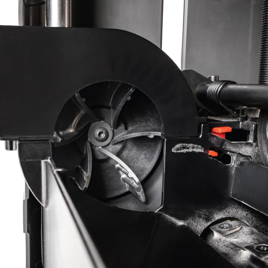 Hoblovku IGM PS33 Spiral lze používat i bez napojení na externí odsávání, protože je vybavena integrovaným ventilátorem a prachovým sáčkem pro účinný odvod pilin přímo od válce. Pokud preferujete klasické odsávání, můžete stroj snadno připojit k průmyslovému vysavači nebo odsavači prachu a pilin.