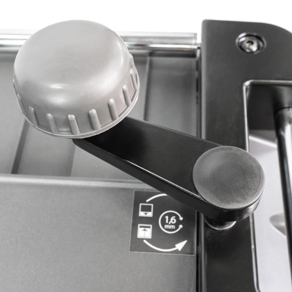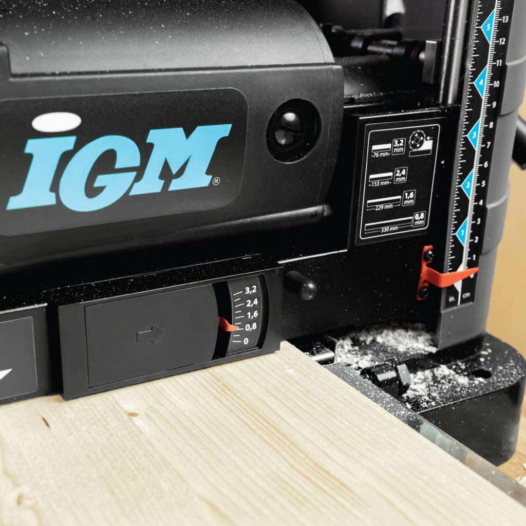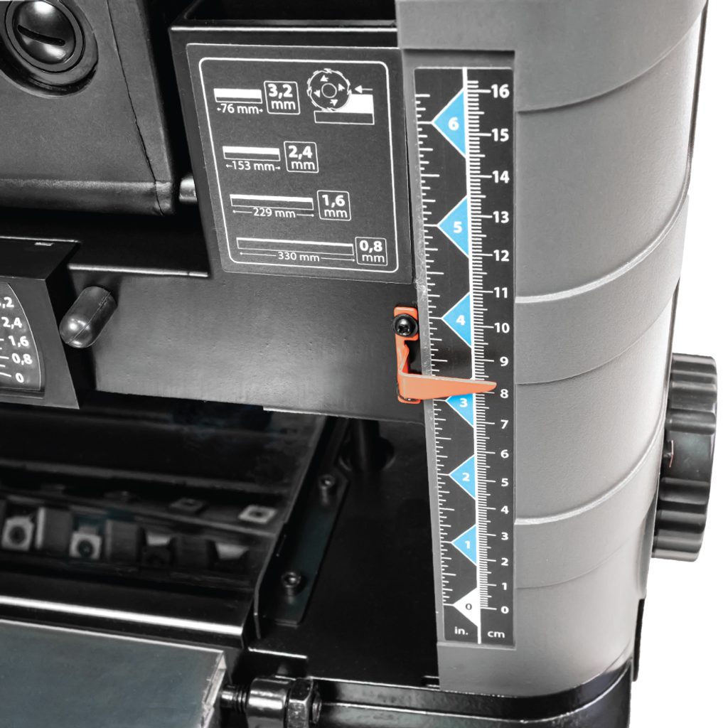 Pro pohodlné opakované tloušťkování větších sérií dílců se stejnou tloušťkou je na boční straně stroje umístěn hloubkový doraz. Ten lze nastavit do 7 poloh v rozsahu od 3,2 mm do 38 mm.