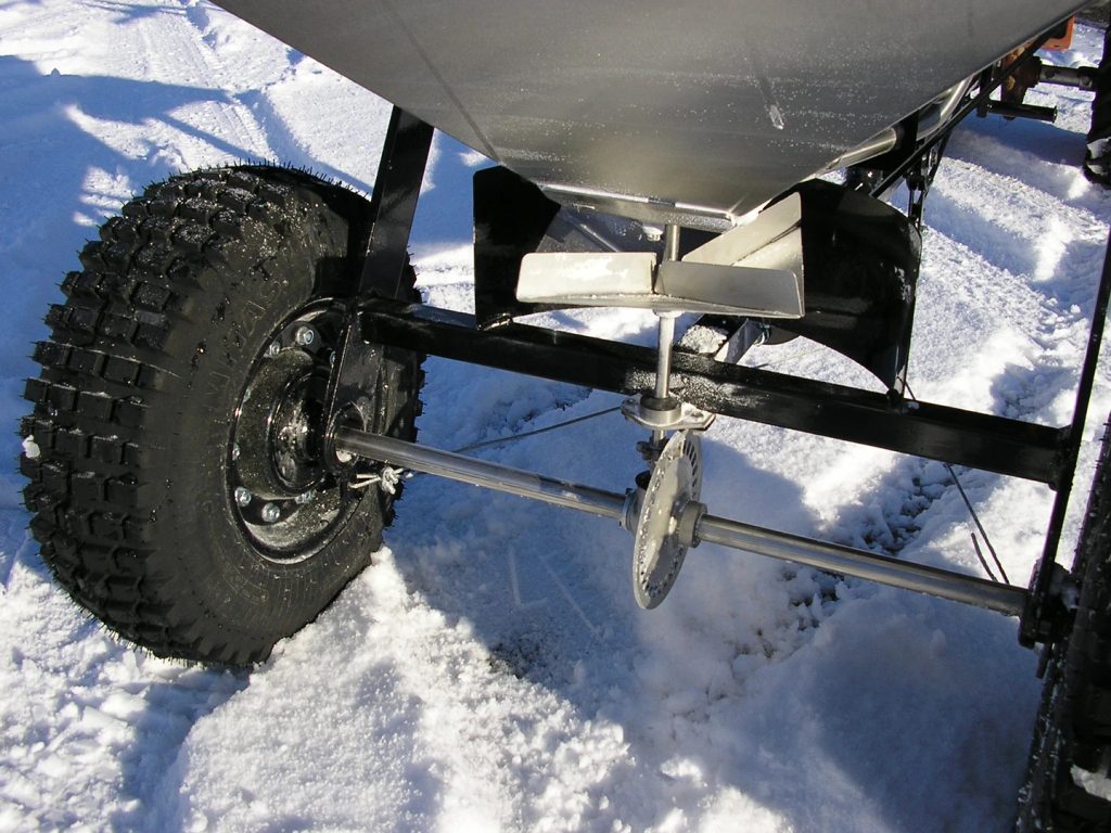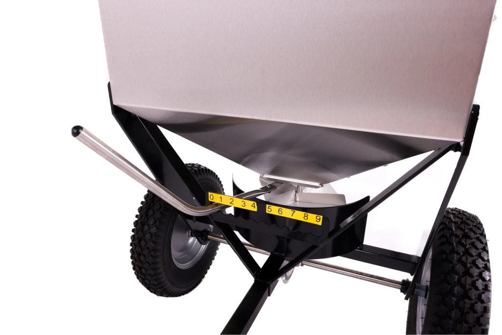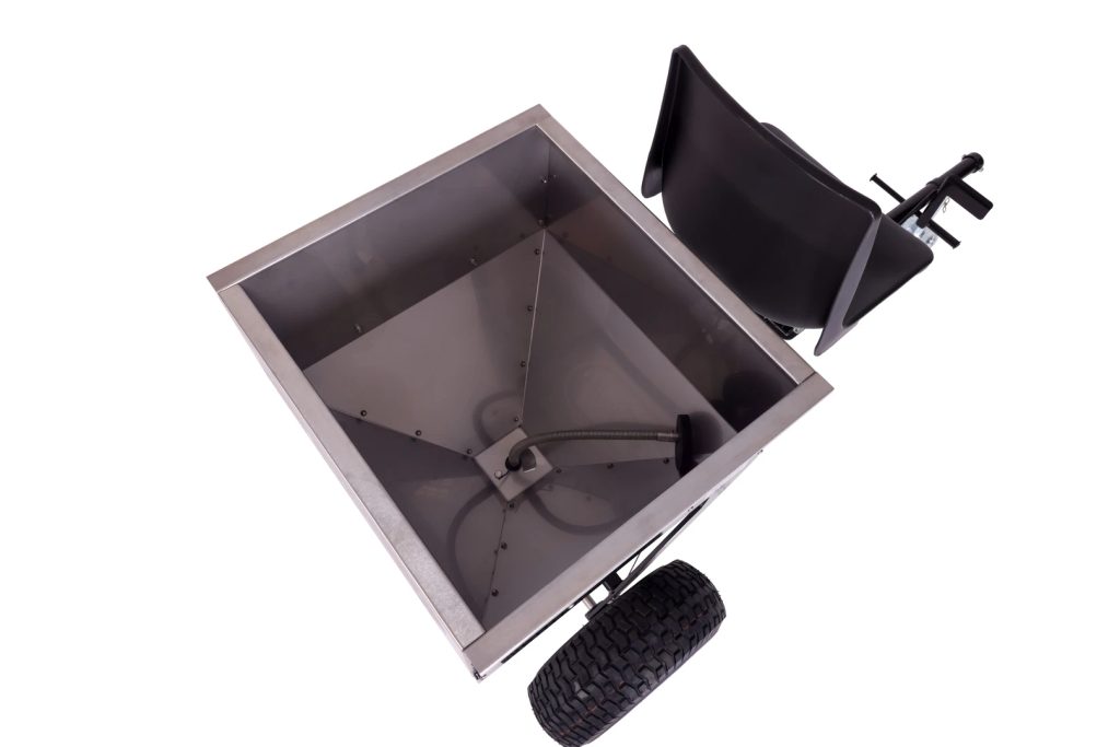 Celonerezová korba s objemem 100 litrů zajišťuje dostatečnou kapacitu pro jakýkoli úkol, zatímco komfortní ovládání umožňuje snadnou regulaci posypu přímo z místa řidiče, a to i během jízdy.