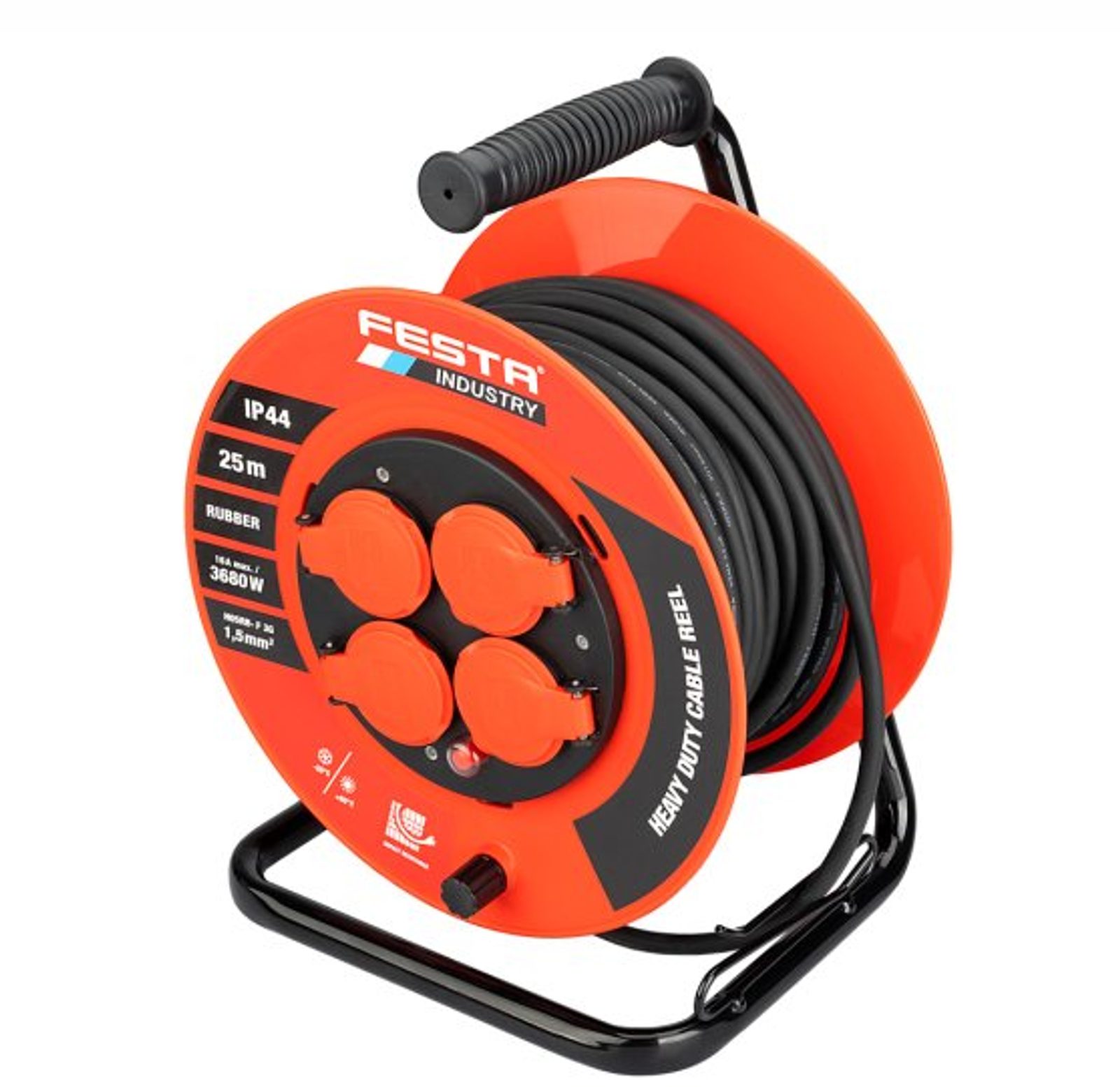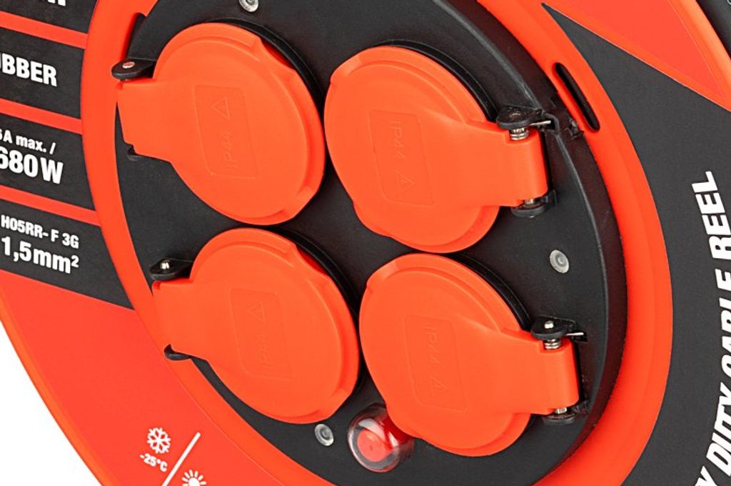 Venkovní prodlužovací kabel na bubnu FESTA INDUSTRY 3×1,5 mm² (37750) je spolehlivý pomocník pro venkovní použití na stavbách i v náročných provozech. Kabel je dlouhý 25 m a vybaven čtyřmi zásuvkami na 230 V, což umožňuje připojit více zařízení najednou. Díky většímu průřezu vodičů 3 × 1,5 mm² s gumovou izolací je vhodný pro bezpečný provoz s maximálním zatížením 3680 W (16 A) při plně rozvinutém bubnu, nebo 1100 W (4,8 A) při navinutém kabelu.