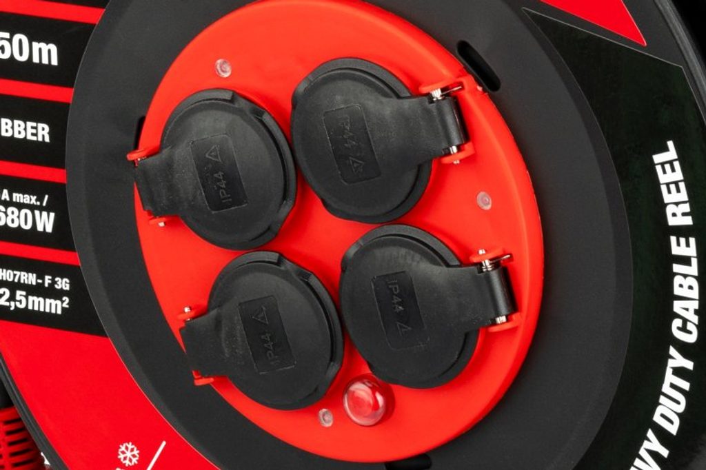 Krytí IP44 zaručuje odolnost proti prachu a stříkající vodě. Masivní kovová konstrukce bubnu zajišťuje snadnou manipulaci i stabilní instalaci, zatímco cívka bubnu je vyrobena z kvalitního a odolného ABS plastu. Samozřejmostí je také tepelná pojistka proti přehřátí kabelu pro ještě větší bezpečnost při použití.