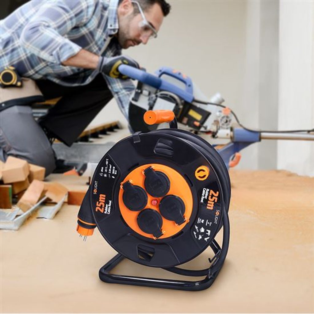 Buben nabízí 4 zásuvky 230 V s dětskými pojistkami a krytkami, krytí IP44 umožňuje použití ve venkovním prostředí. Pro bezpečný provoz je k dispozici tepelná pojistka a aretační brzda proti samovolnému navíjení.