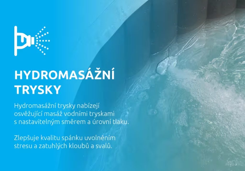 Intuitivní ovládací panel aktivuje 140 vysoce výkonných bublinkových trysek, které masáží uvolní a povzbudí každý sval. Kromě toho si můžete dopřát i silnou hydromasáž díky šesti hydromasážním tryskám. Integrovaný topný systém umožňuje snadno upravit teplotu vody podle vaší momentální nálady, což zajišťuje komfortní relaxaci v každém ročním období.