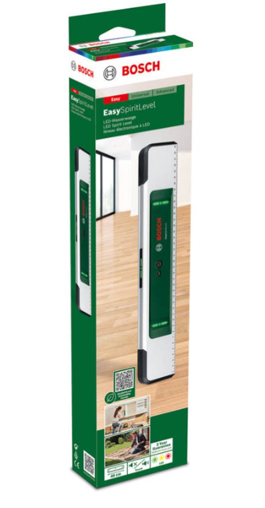 Vodováha Bosch EasySpiritLevel se vyznačuje jedinečnými LED šipkami, které intuitivně ukazují směr pro snadnou nivelaci. S přesností na 0,1° při standardních úhlech 0°, 90°, 180° a 270° je tato vodováha skvělá pro zarovnávání kuchyňských skříněk, zaměřování teras nebo jiné stavební práce.