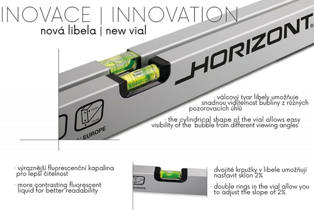 Vodováha HORIZONT VVM je profesionální hliníková vodováha v magnetickém provedení, navržená pro přesnou a pohodlnou práci i v náročných podmínkách. Je vybavena inovovanou horizontální válcovou libelou, která je skvěle čitelná ze všech úhlů pohledu, takže hodnotu snadno zkontrolujete i v nepohodlné poloze.