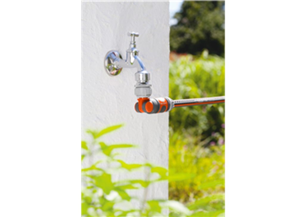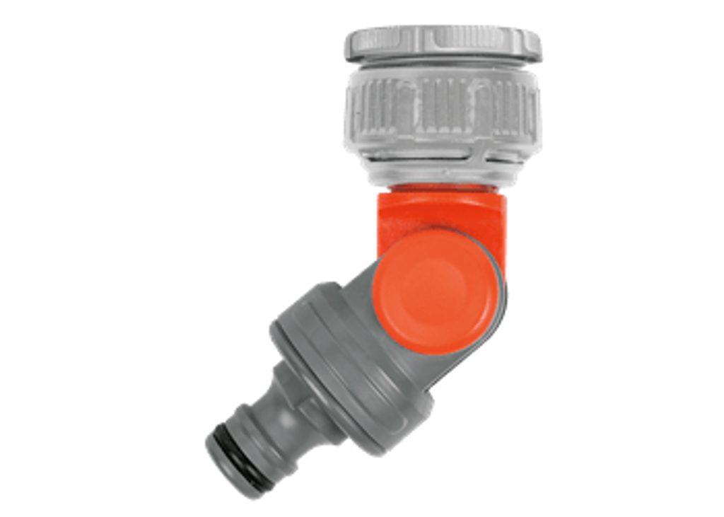 S výkyvnou přípojkou GARDENA lze připojit hadici na vodovodní kohoutek. Přípojka je výkyvná a otočná. Zabraňuje zalamování a přetáčení hadice u kohoutku. Voda může bez překážek proudit a hadice se nepoškozuje.