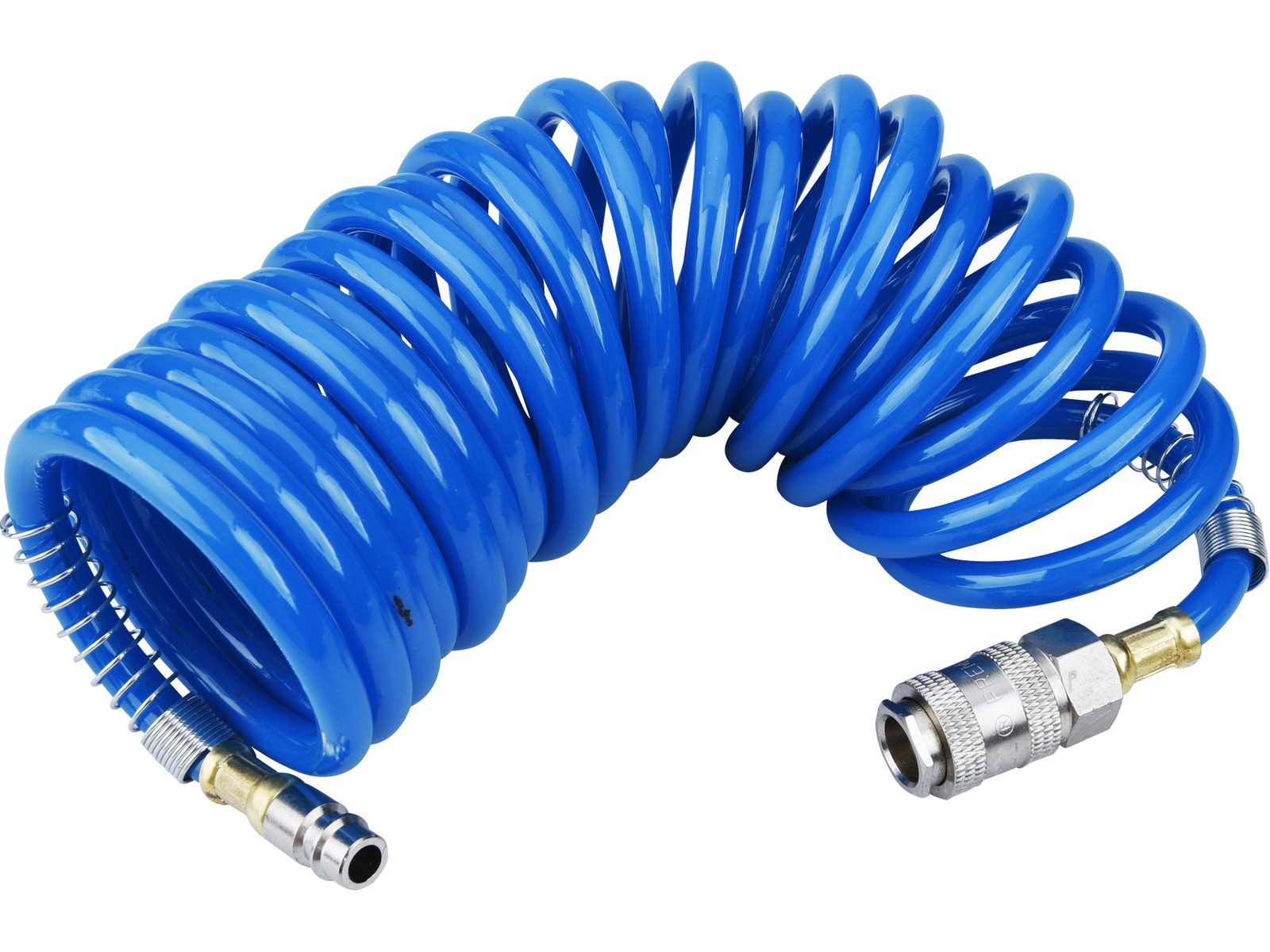 Spirálová vzduchová hadice PU s mosaznými rychlospojkami. Hadici lze použít se všemi zařízeními poháněnými vzduchem v dílnách, garážích, továrnách apod.
