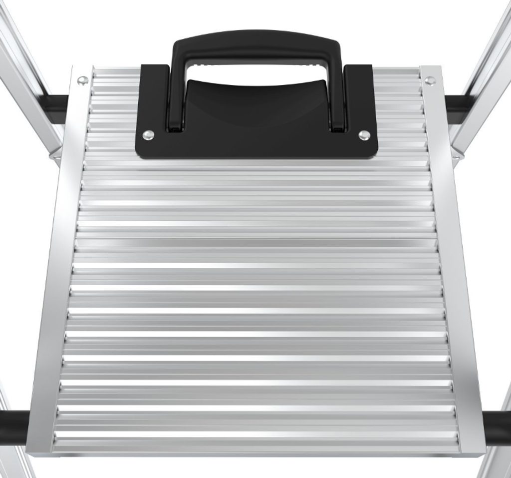 Žebřík je vybaven speciálně navrženou pracovní plošinou v horní části, která poskytuje maximální stabilitu a pohodlí při dlouhodobém stání. Toto ergonomické řešení významně přispívá k lepší rovnováze a celkovému komfortu při práci ve výškách.