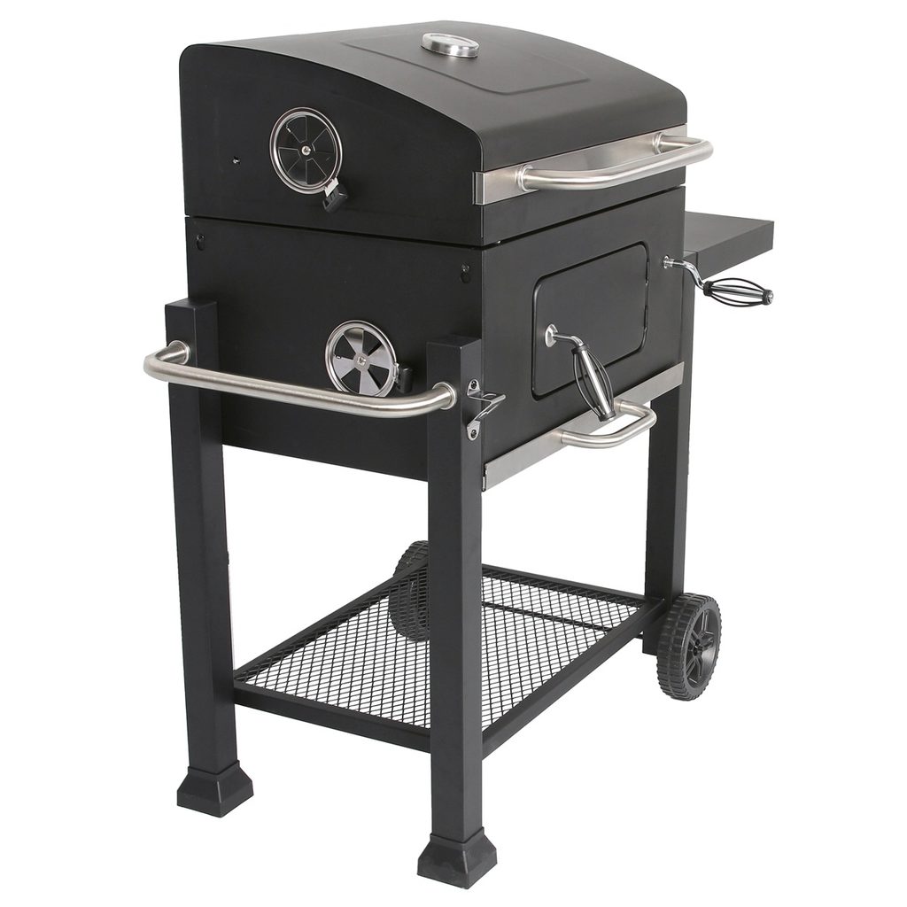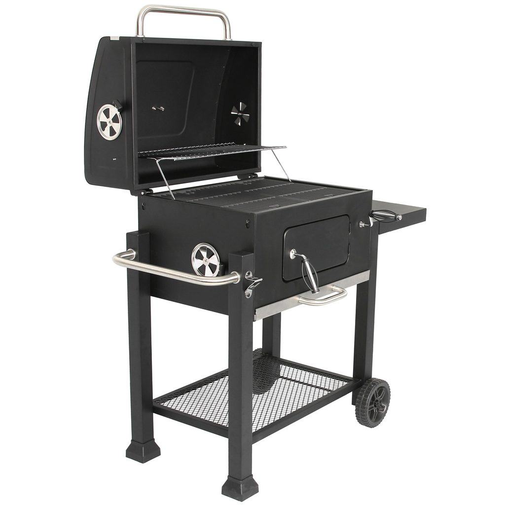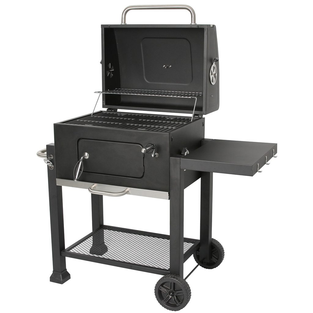 Gril je vybaven hlubokým víkem s madlem a dobře čitelným teploměrem, což vám umožní mít teplotu uvnitř grilu vždy pod kontrolou. Praktický sklopný boční stolek s háčky poslouží k zavěšení grilovacího náčiní, utěrky nebo jiných potřebných doplňků. Ve spodní části grilu se nachází odkládací plocha pro další příslušenství. Součástí výbavy je také integrovaný otvírák na láhve, což oceníte při každé grilovací akci.