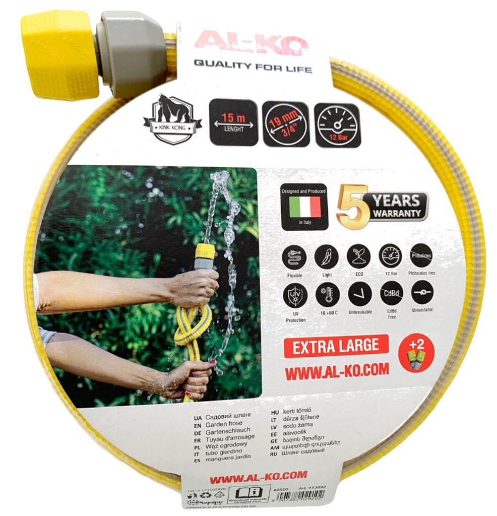 Zahradní hadice AL-KO ARMADILLO 3/4" o délce 15 m je moderní, super lehká a praktická hadice, která je navržena tak, aby usnadnila každodenní zahradnické práce. Díky své inovativní konstrukci váží až třikrát méně než tradiční zahradní hadice, což zajišťuje snadnou manipulaci a pohodlné přenášení. Tato hadice je kompletně vyrobena v Itálii a představuje ideální volbu pro každého, kdo hledá lehkou, odolnou a spolehlivou zahradní hadici.