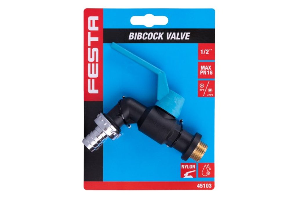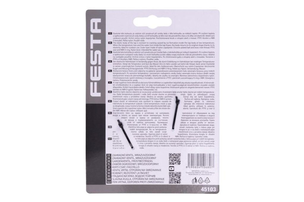 Zahradní kohout FESTA 45103 je pákový ventil se závitem 1/2", určený pro venkovní rozvody vody na zahradě, u domu nebo v dílně. Pákové ovládání umožňuje rychlé a jednoznačné otevření i uzavření průtoku, což usnadňuje běžné používání například při napouštění konví, připojení hadice nebo obsluze zavlažování.