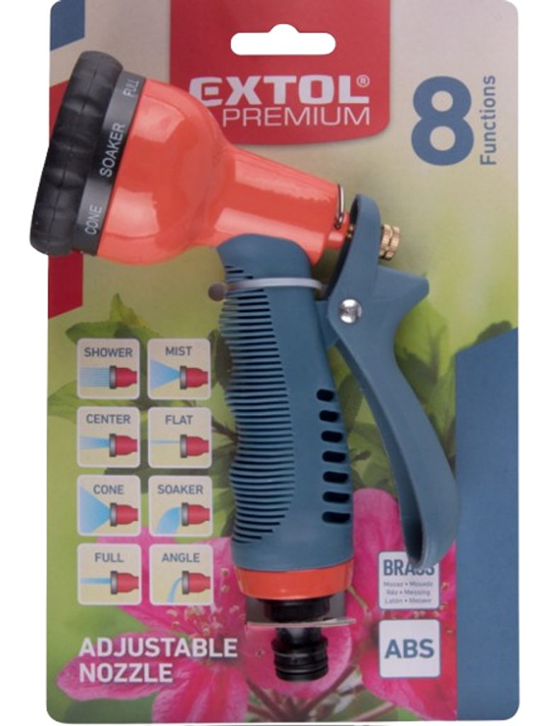 Zavlažovací pistole EXTOL PREMIUM 8876452 je praktický pomocník pro každou zahradu, který vám umožní snadno a pohodlně zalévat záhony, trávník i květiny v květináčích. Nabízí celkem 8 různých profilů stříkacích trysek, které lze velmi rychle přenastavit přesně podle vašich potřeb. Průtok vody lze navíc jednoduše aretovat pro ještě pohodlnější práci.