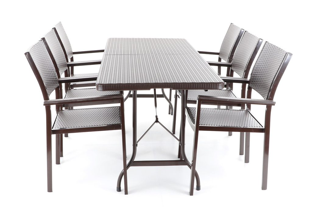 Dopřejte si stylové a pohodlné posezení s moderní zahradní sestavou Elba 6 VeGA, která je ideální nejen na zahradu, ale i na terasu, do pergoly nebo k bazénu. Sestava obsahuje šest křesel z ocelových profilů, jejichž čalounění je vyrobeno z odolného lisovaného plastu v imitaci umělého ratanu s UV filtrem. Stůl je rovněž z ocelových profilů a jeho deska perfektně ladí s křesly, díky povrchové úpravě komaxitovou barvou a modernímu ratanovému designu.