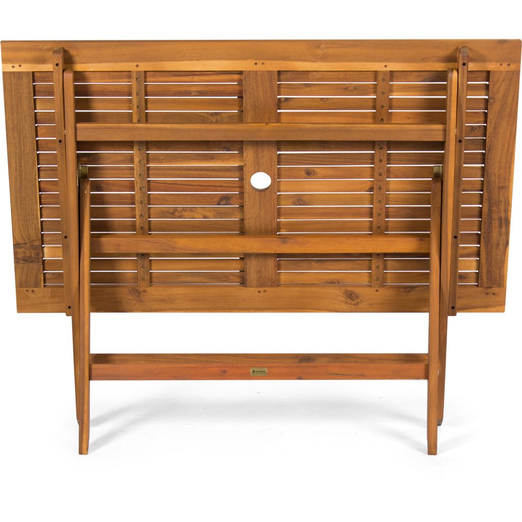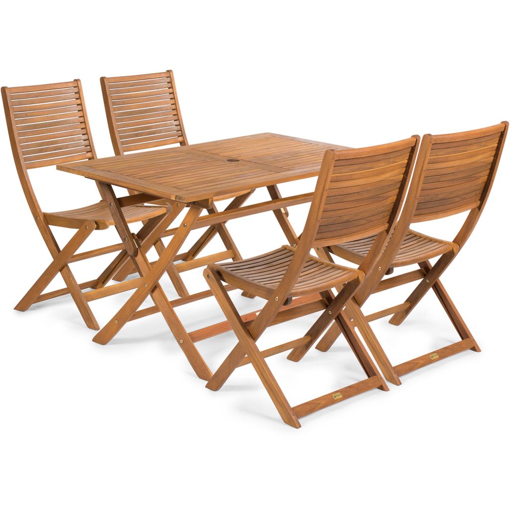 Stůl o rozměrech 120 × 70 × 74 cm je vybaven praktickým otvorem pro slunečník, který vám zajistí stín i během horkých letních dnů. Díky možnosti složení stolu i židlí šetříte místo při skladování, což oceníte zejména mimo sezónu nebo při přepravě. Skládací židle s nosností až 110 kg poskytují pohodlí a zároveň mají ve složeném stavu minimální nároky na prostor. Pro ještě větší komfort si můžete dokoupit podsedáky.