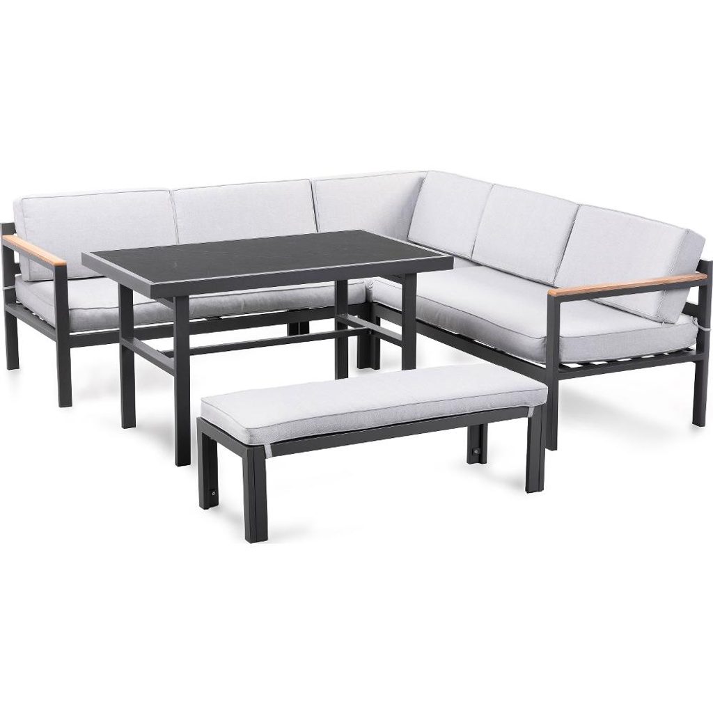 Šedé univerzální provedení snadno oživíte barevnými dekoracemi podle svého vkusu. Konstrukce z pevné oceli je nejen stabilní a odolná, ale také nenáročná na údržbu, takže vám bude sloužit po mnoho let. Stůl má desku z moderního umělého kamene, která je nejen elegantní, ale také odolná vůči poškrábání a opotřebení. Součástí sestavy je i pohodlné polstrování z polyesteru s tloušťkou 9 cm, které zajišťuje maximální komfort.