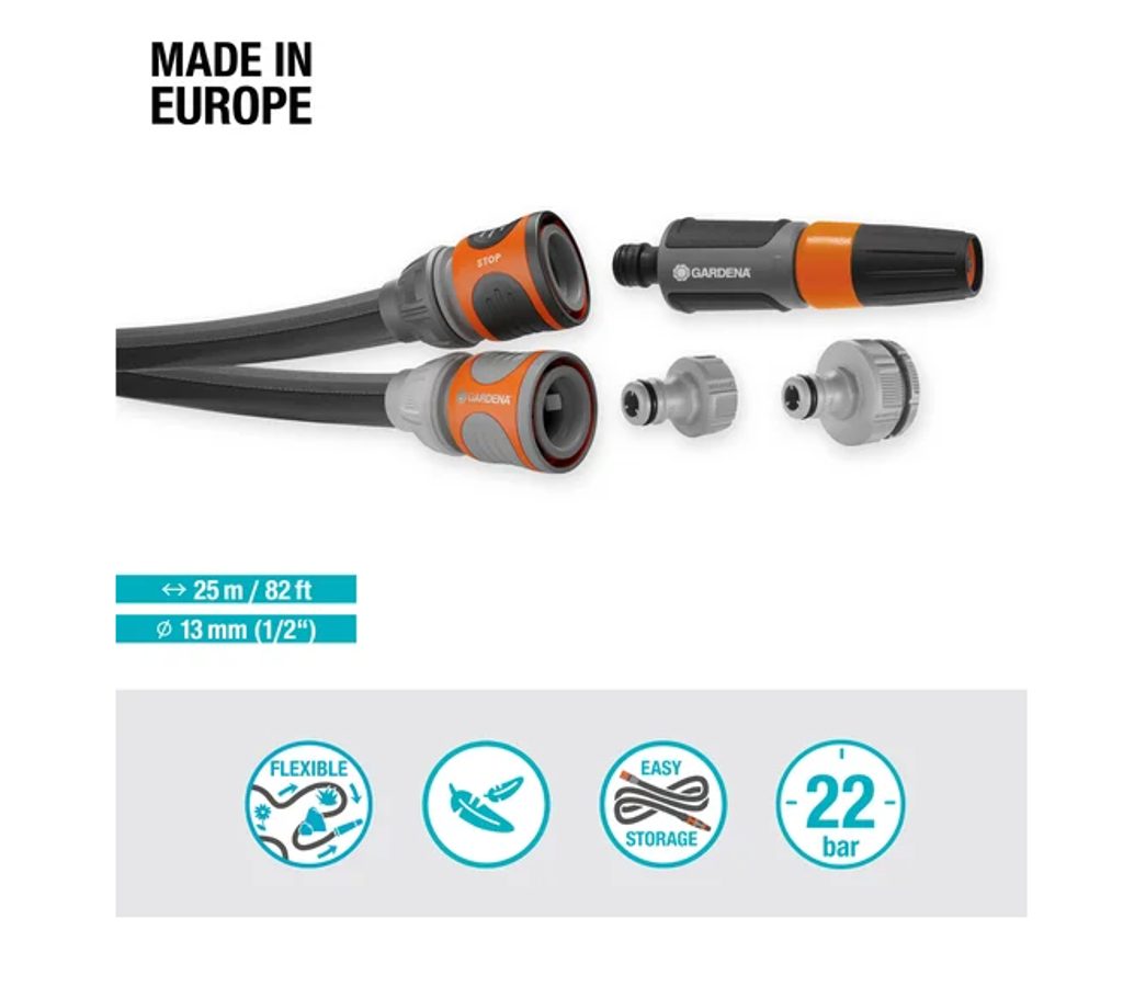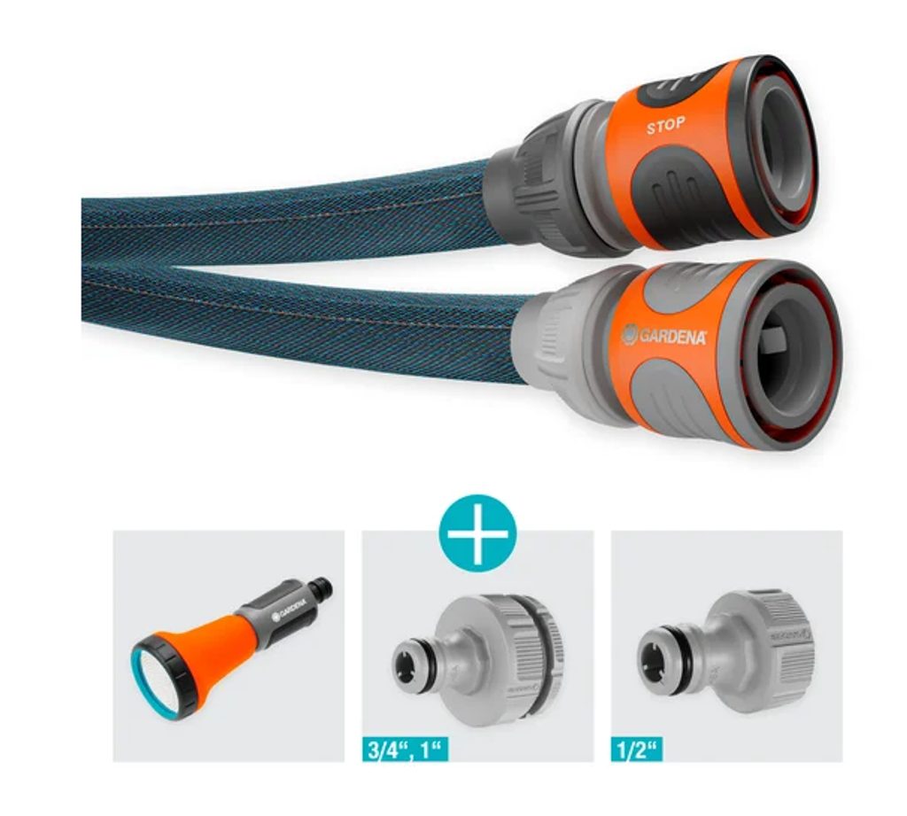 Sada obsahuje vše, co potřebujete k okamžitému použití: 15 metrů dlouhou hadici s vnitřní PVC výztuží, rychlospojky Liano™, stopspojku, dvě šroubení na vodovodní kohoutek (včetně redukčního kloubu), a navíc postřikovač. Hadice se nezalamuje, nekroutí a díky extrémně nízké hmotnosti (až o 50 % lehčí oproti klasickým hadicím) vás nebude omezovat ani při delším zalévání.