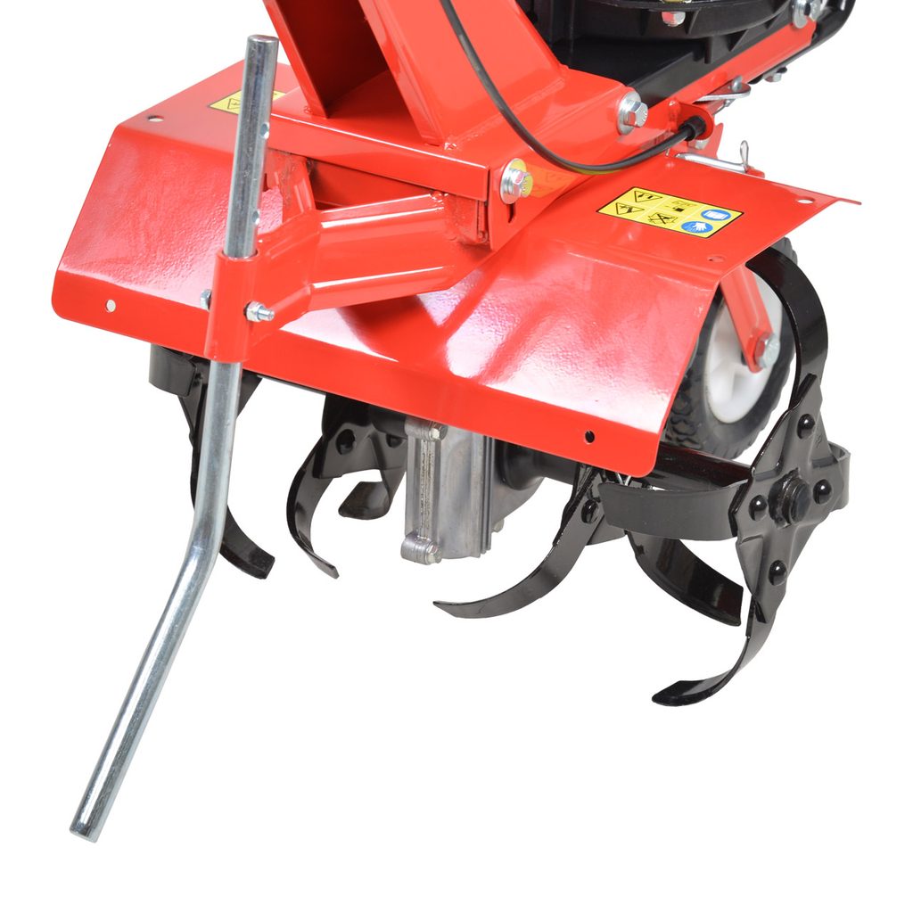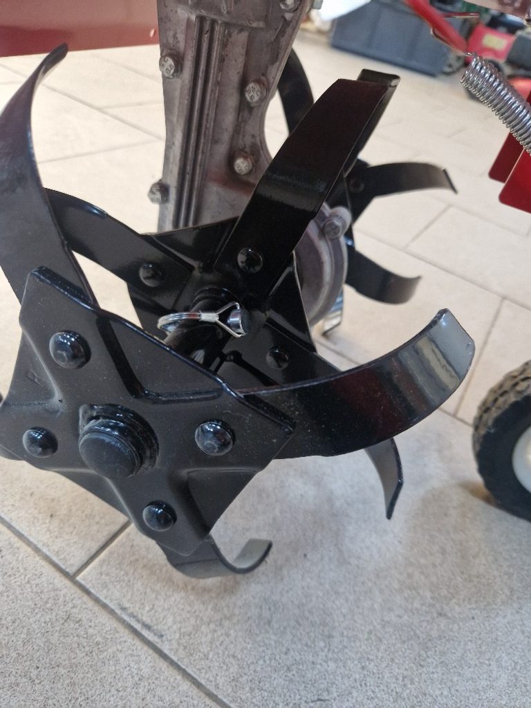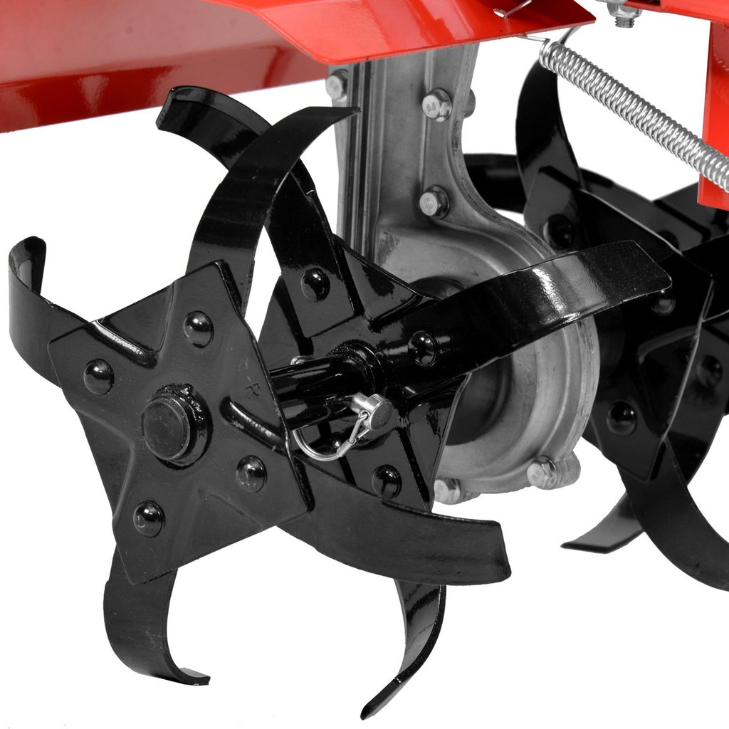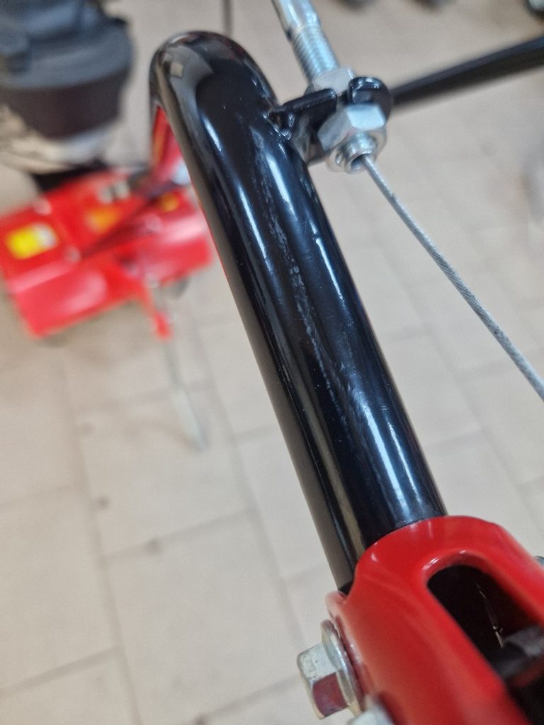 Přední polohovatelné kolečko využijete nejen při pojíždění, jeho další funkcí může být i lepší kontrola nad hloubkou zapracování. Zadní nastavitelná radlička - ostruha slouží jako brzda, která nejen snižuje fyzickou náročnost obsluhy, ale zároveň zvyšuje kvalitu rozmělnění struktury půdy. Ocelová řídítka dávají obsluze dokonalou kontrolu nad strojem. Samozřejmostí je pojistka páky spojky bránící náhodnému roztočení nožů. Díky ocelové konstrukci má stroj dlouhou životnost.