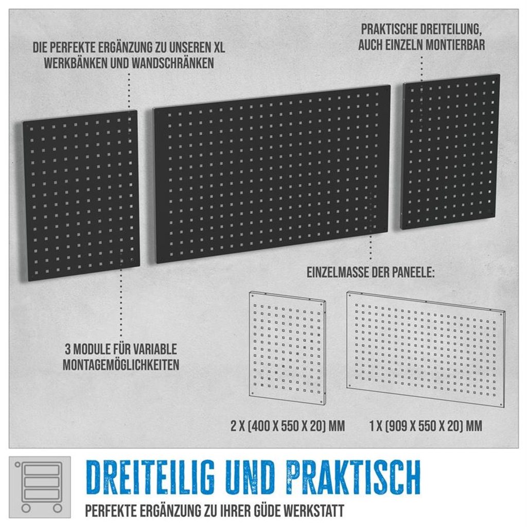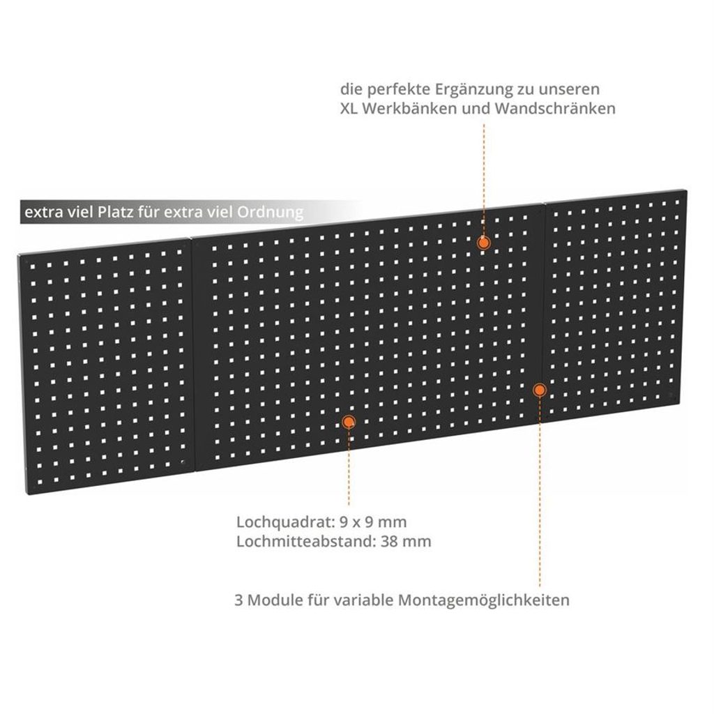Tato 3dílná perforovaná stěna XL je dokonalým doplňkem řady GÜDE Eco Line, díky kterému lze nyní optimálně využít i prostor na stěně nad našimi dvěma pracovními stoly XL.