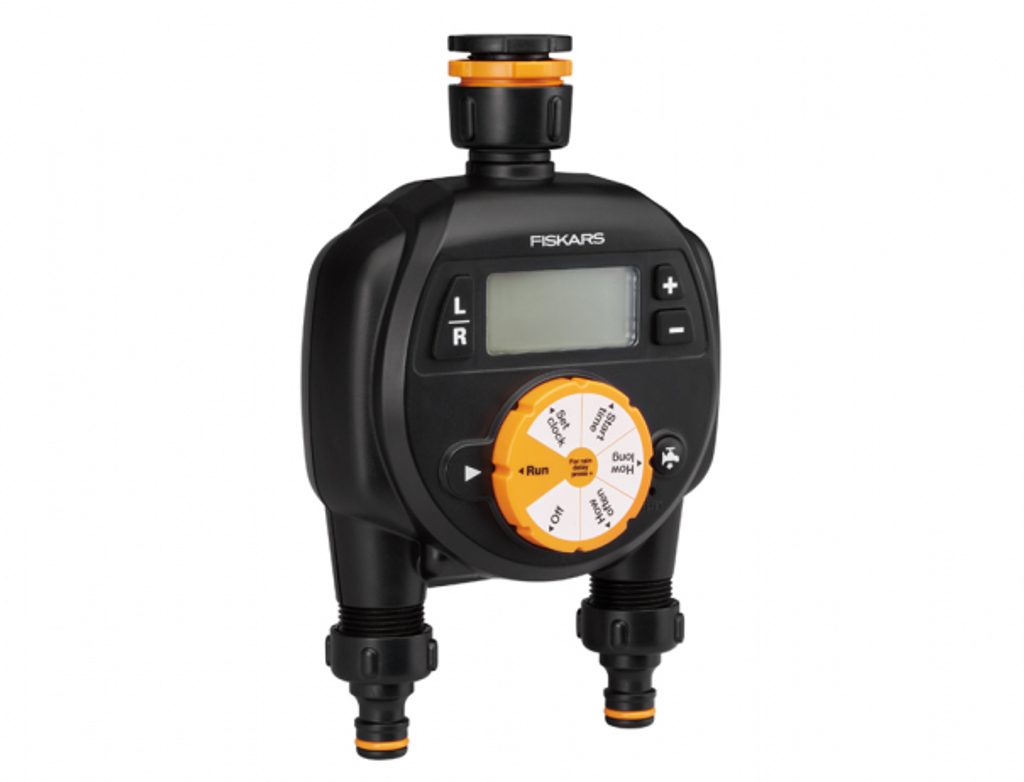 Zavlažovací časovač Fiskars 1054792 je napájen dvěma AA bateriemi (nejsou součástí balení) a lze ho bez problémů použít s většinou běžně dostupných zavlažovacích systémů různých značek.