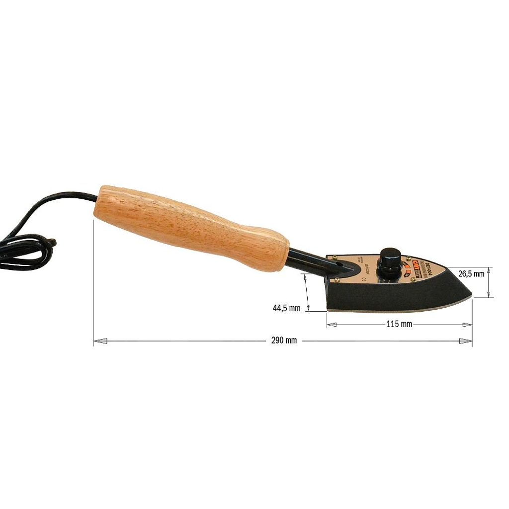 Žehlička je určená pro olepování hran s lepidlem (nažehlovací hrany). Po nastavení požadované teploty stačí hranu přiložit, plynule projet po celé délce a následně hranu zarovnat ořezávačem. Nepřilnavý povrch minimalizuje údržbu a čištění nástroje, zabraňuje připékání lepidla, poškození hrany a umožňuje hladký pohyb.