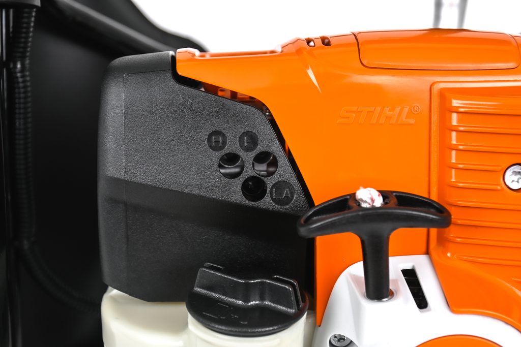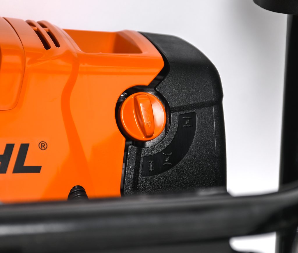 Všechny prvky pro ovládání motoru jsou integrovány v pravé rukojeti. Obsluha stroje probíhá tlakem prstu, přičemž ruka zůstává v pracovní pozici.