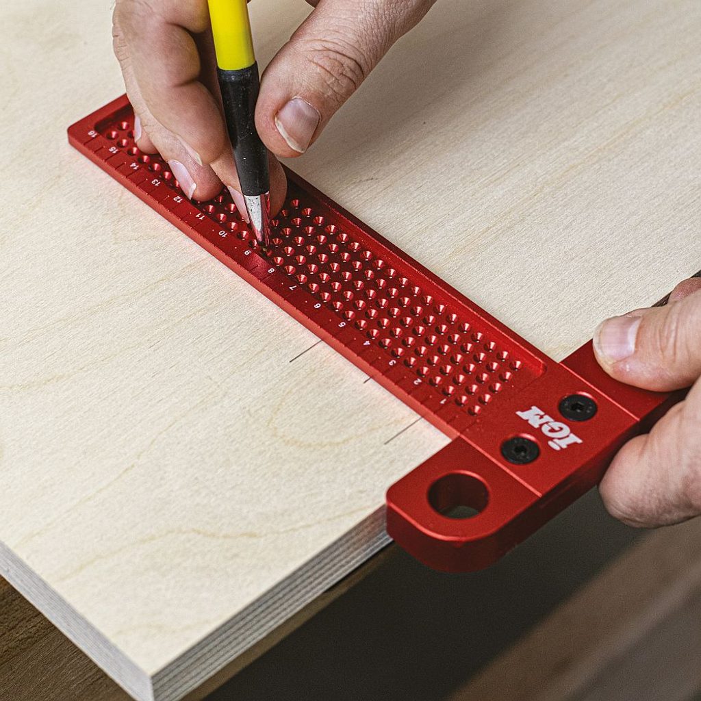 Vložte tužku do požadovaného značicího otvoru a příložník přiložte k hraně dílce. Plynulým posouváním podél hrany jednoduše vytvoříte dokonale rovnoběžnou čáru ve zvolené vzdálenosti. Každý otvor představuje 1 mm, takže nastavení je rychlé, přesné a bez nutnosti neustálého měření metrem či pravítkem.